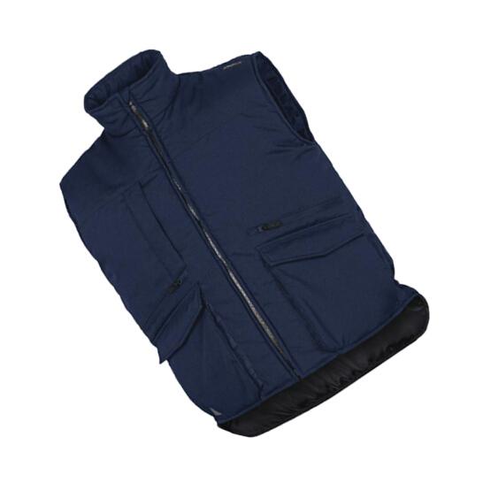 保暖馬甲,65%聚酯滌綸,35%棉。聚酰胺襯里。領(lǐng)口有固定扣。前面拉鏈外有沿邊,并由粘扣扣牢。衣服下方有2個口袋,外有沿邊,并由粘扣扣牢,2個側(cè)袋。下方還有2個拉鏈?zhǔn)娇诖?個胸部口袋由粘扣粘牢。1個錢包袋由粘扣扣牢。內(nèi)部彈性袖口。衣服背后底部兩側(cè)彈性收緊。